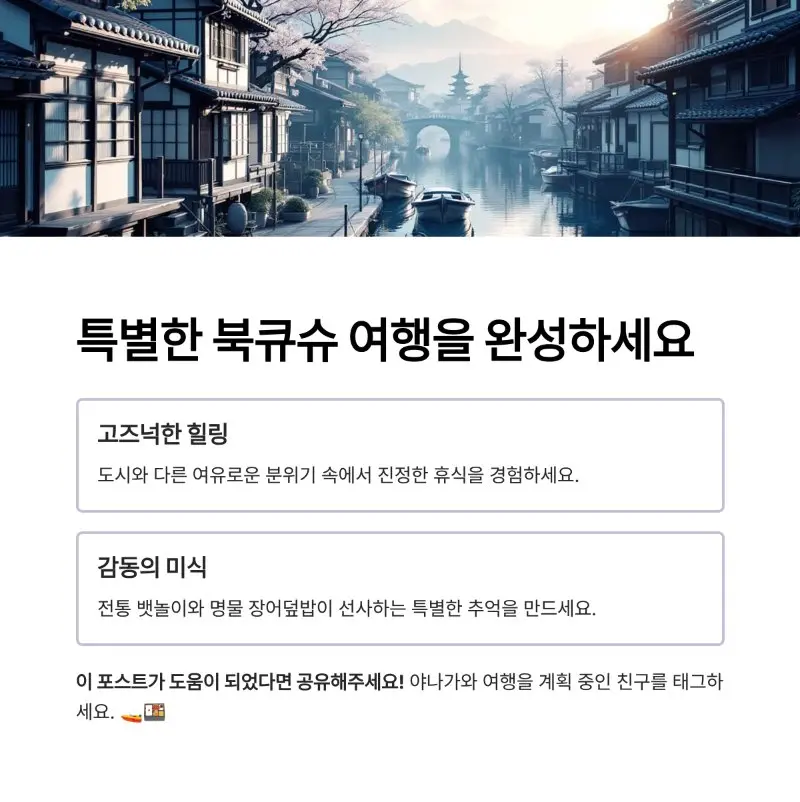 야나가와는 후쿠오카의 화려함과는 또 다른, 고즈넉하고 여유로운 매력을 지닌 곳입니다. 뱃사공의 노래를 들으며 물길을 따라 흐르는 시간, 그리고 뜨끈하고 부드러운 장어덮밥 세이로무시 한 그릇은 분명 여러분의 북큐슈 여행에 잊지 못할 추억과 깊은 감동을 선사할 것입니다. 바쁜 일상에서 벗어나 진정한 '쉼'을 찾고 싶다면, 야나가와로 떠나보세요. 제가 강력히 추천하는 야나가와 미식 유람 코스와 함께, 여러분의 여행이 더욱 풍요로워지기를 바랍니다. 다음번에는 또 어떤 북큐슈의 숨겨진 보석 같은 곳을 소개해 드릴지 기대해주세요!
