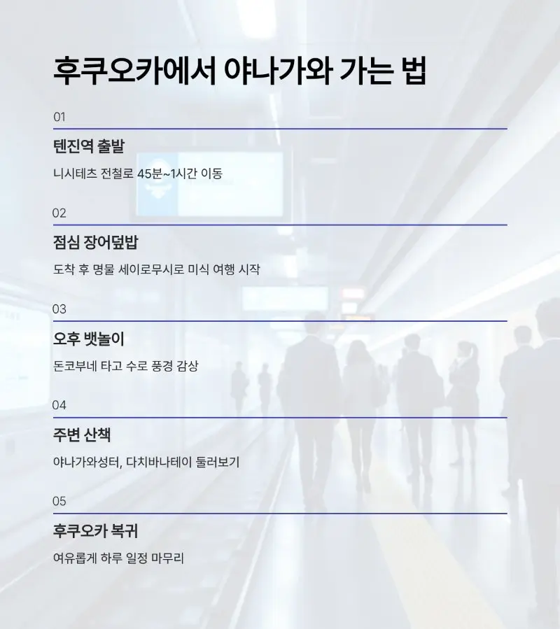 - 온라인 예약: 각 회사 홈페이지나 클룩, 와그 등 여행 플랫폼을 통해 미리 예약하면 편리합니다. 특히 후쿠오카에서 출발하는 니시테츠 열차 왕복권과 뱃놀이 탑승권이 포함된 '야나가와 특급 티켓'을 구매하면 더욱 경제적입니다.