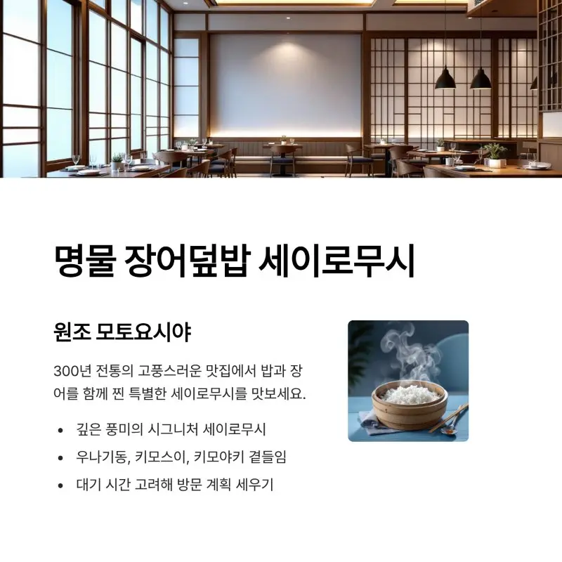 세이로무시는 대나무 찜통에 양념한 밥을 깔고, 그 위에 잘 구워낸 장어를 올린 후 다시 한 번 쪄내는 방식의 장어덮밥입니다. 이렇게 쪄내는 과정을 통해 장어는 더욱 부드럽고 촉촉해지며, 밥알 하나하나에 장어의 풍미와 특제 소스가 깊숙이 배어들어 환상의 맛을 선사합니다. 뜨끈하게 유지되는 온기 덕분에 마지막 한 숟가락까지 따뜻하고 맛있게 즐길 수 있다는 점도 큰 장점입니다.