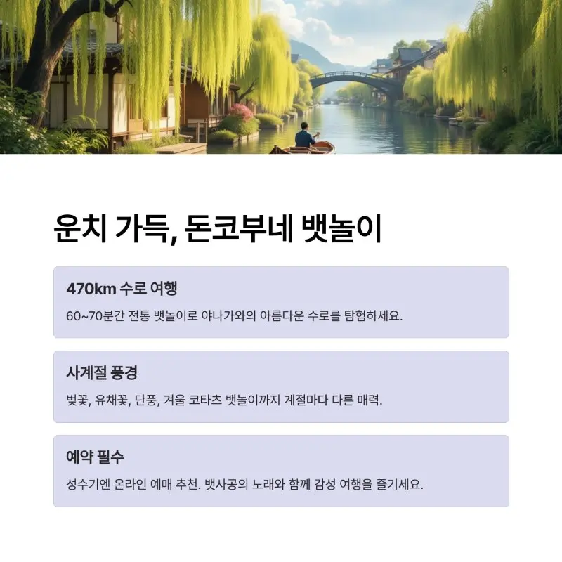 - 봄 (3월~4월): 벚꽃과 유채꽃이 만개하여 가장 아름다운 시기입니다. 뱃놀이 중 꽃 터널을 지나는 황홀경을 경험할 수 있습니다.