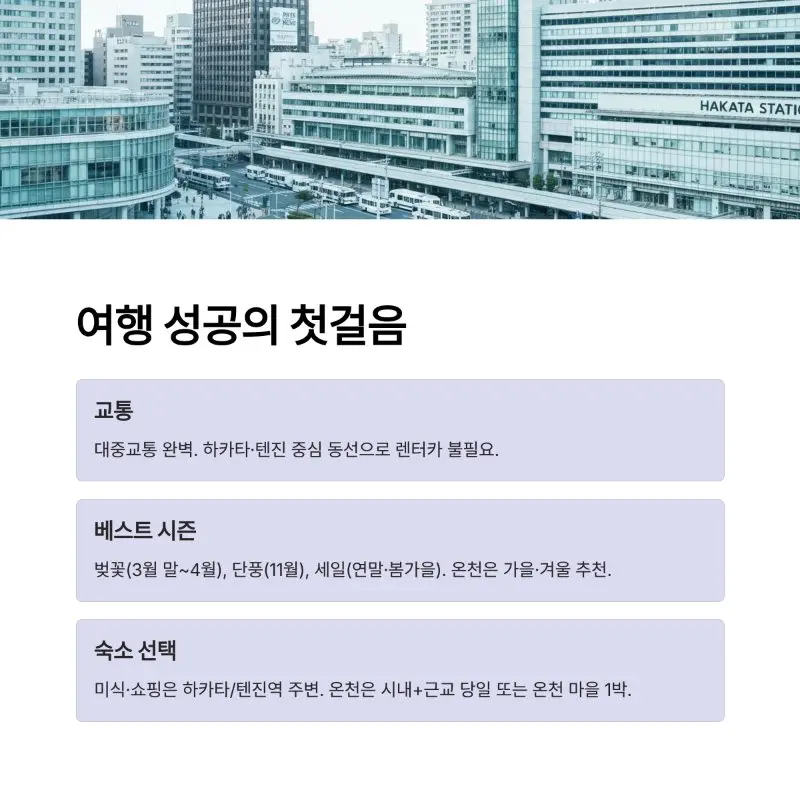* 오후: 후쿠오카 공항 도착 후, 하카타역으로 이동하여 숙소 체크인. 하카타역 주변은 교통의 요지이자 미식의 성지입니다.